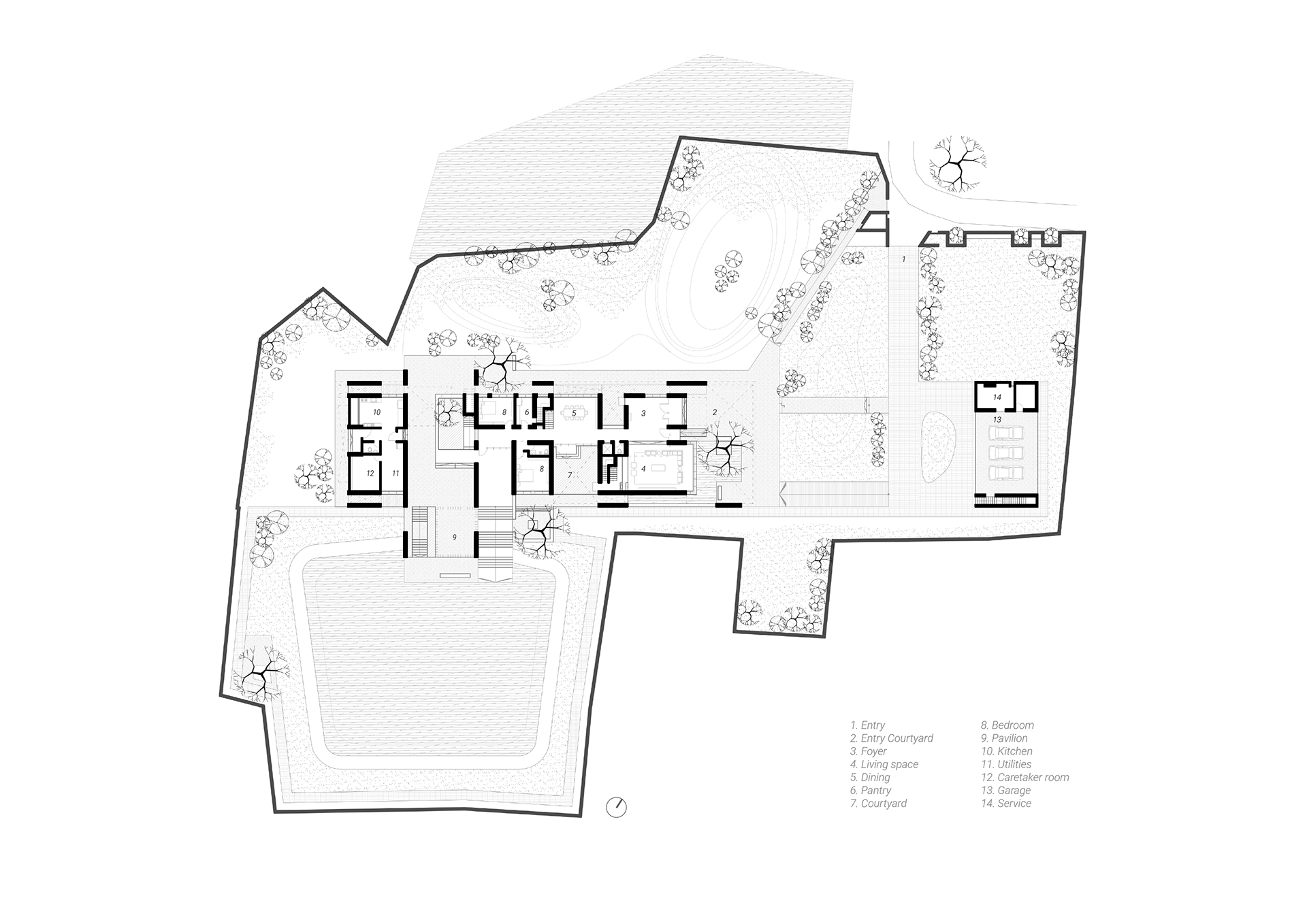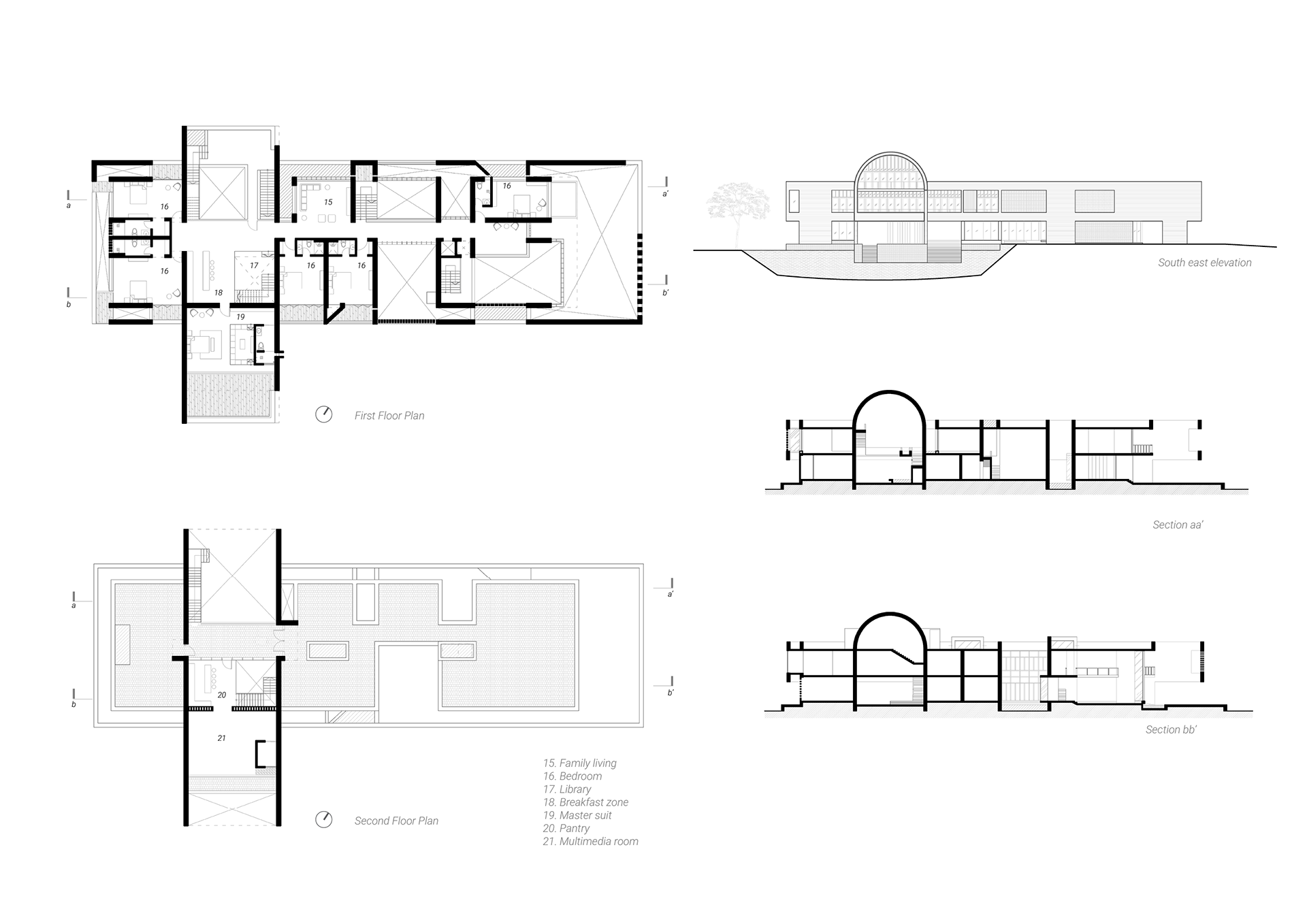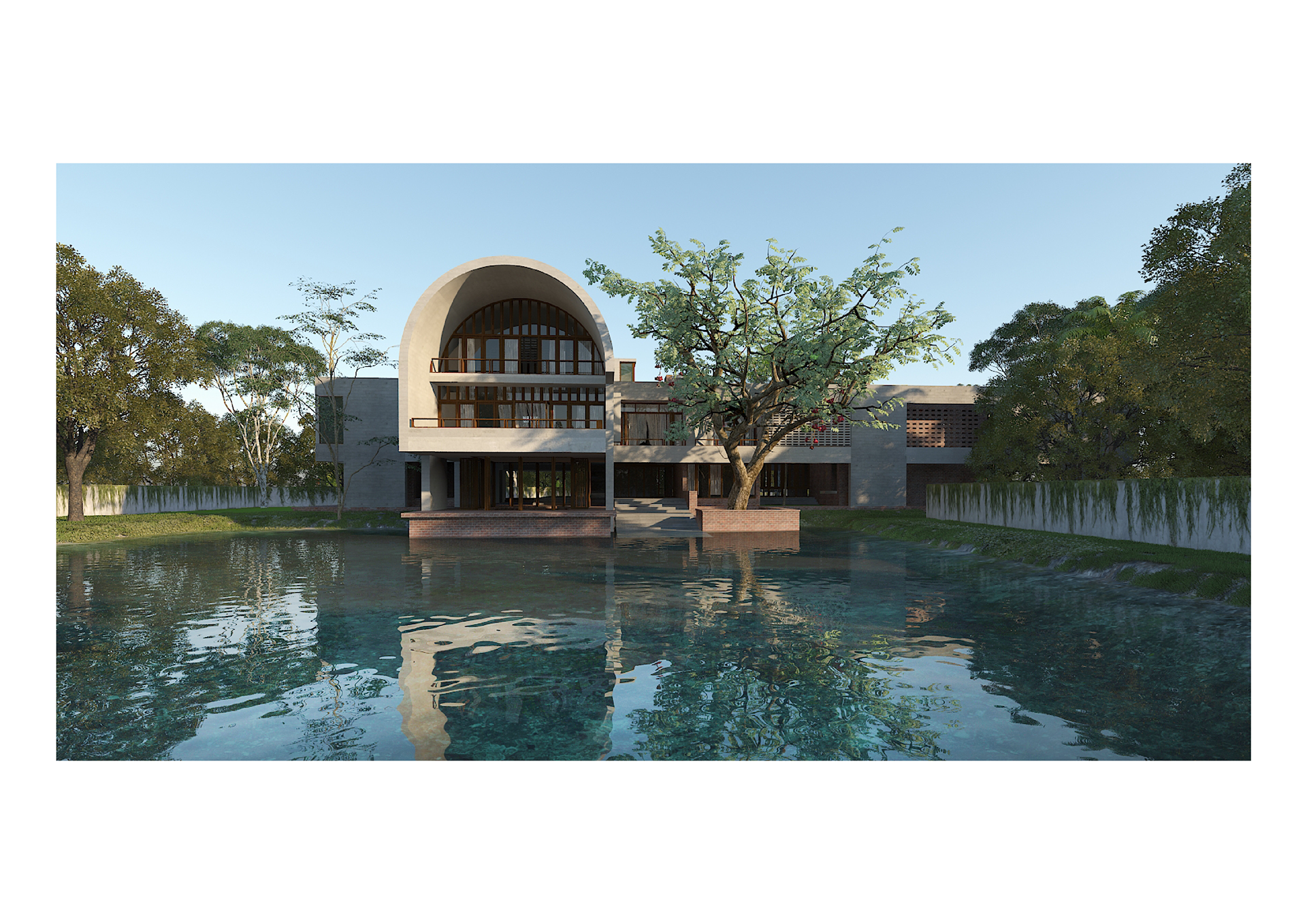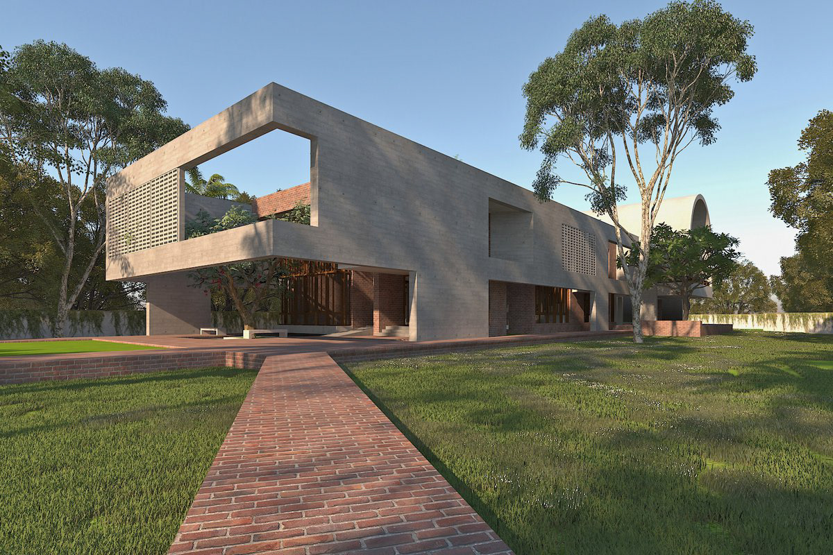 The idea behind the design of this country house was to recreate the memories associated with the site where the client had his childhood. A linear organization of space has been sought out to maximize the highest exposure towards the extraordinary green the surrounding has in offer. A large overhang concrete framing partly enclosed by screen is creating an invitation at the forecourt of the house. An elevated concrete screen is designed in such a way that it embraces the house while ensuring privacy and creating thermal comfort.