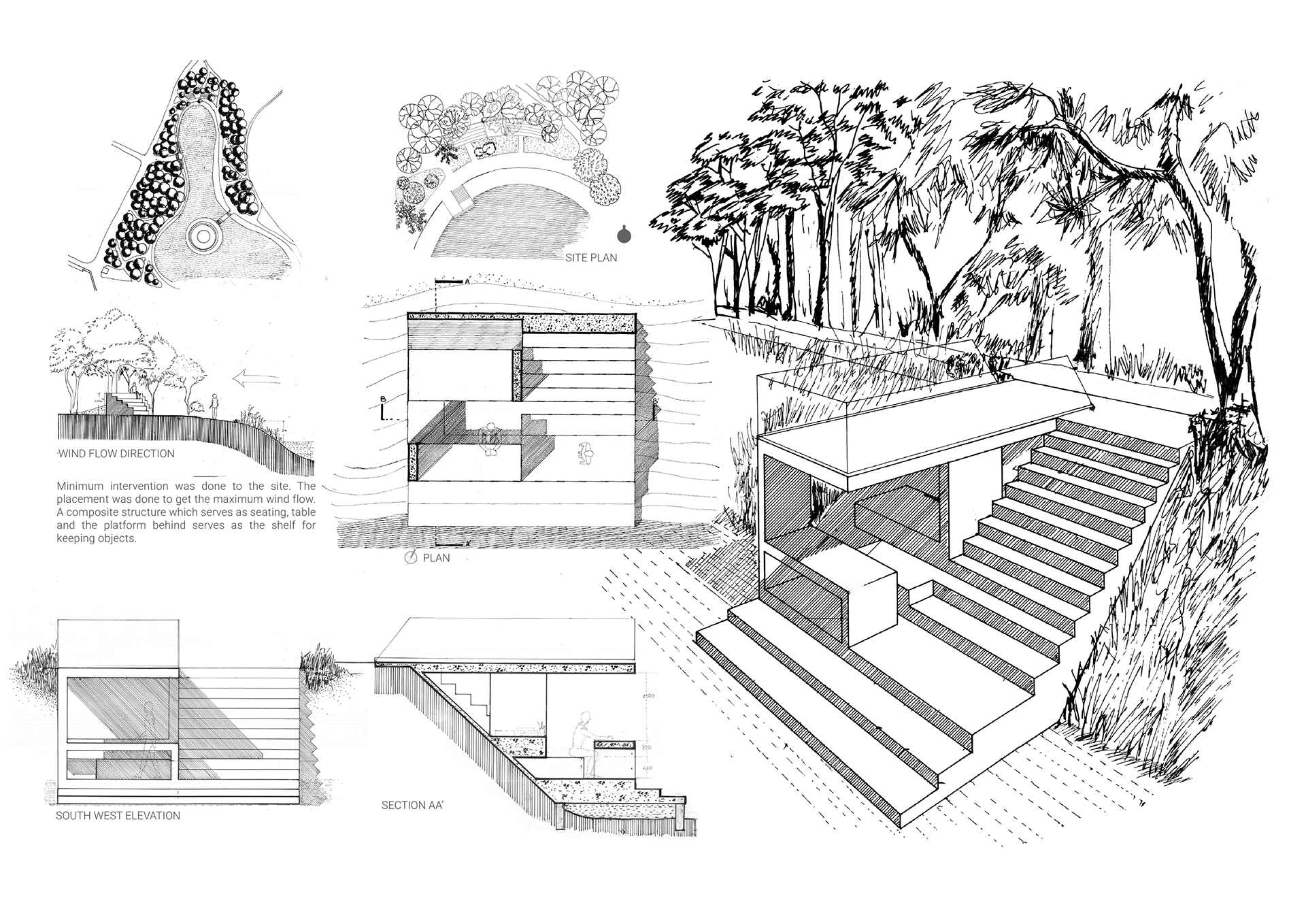 Objective of this project was to design a structure as a personal workstation in a public area. The lakefront in national botanical garden was chosen as the site for its serene beauty. The challenge was to merge the structure with the natural context without disturbing the visitors and the nature itself. There is an existing pathway for the visitors to enjoy the beauty. So, without hampering the view of others the structure was placed in the slope. The roof becomes a viewing platform for the visitors, and the steps emerge as the continuation of the existing structure. Privacy at a minimum degree is attained as well.